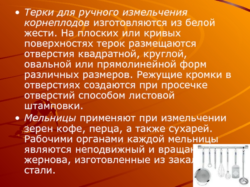 Слайд 13Терки для ручного измельчения корнеплодов изготовляются из белой жести. На плоских