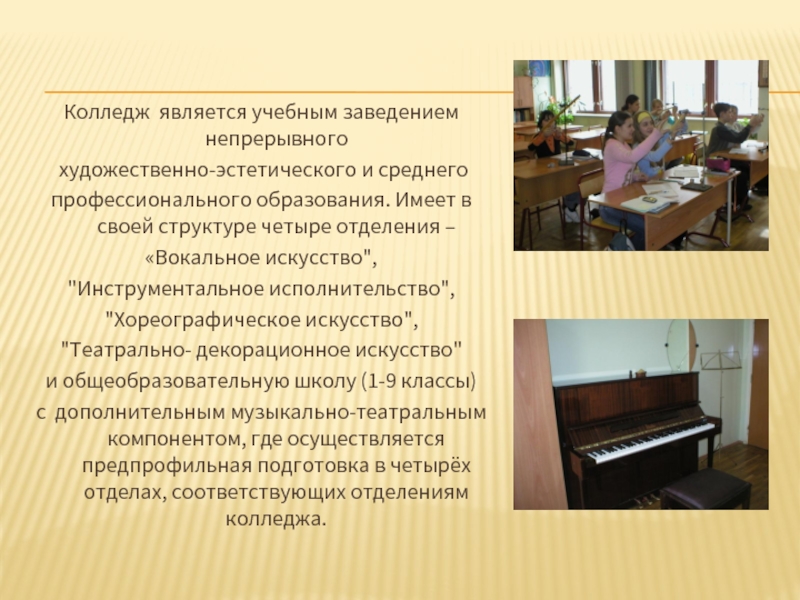 с дополнительным музыкально-театральным компонентом, где осуществляется предпрофильная подготовка в четырёх отделах, соответствующих отделениям колледжа.