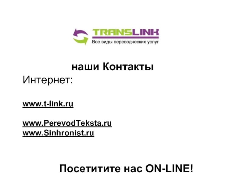 современных технологий – Интернет, спутниковая связь, переводческая система «Традос», «Транзит». Они не только руководят переводческим процессом, контролируют его, но и являются дополнительным проверочным звеном в цепи осуществления заказа. Их характеризует энергия, высокая работоспособность и стремления превзойти ожидания.