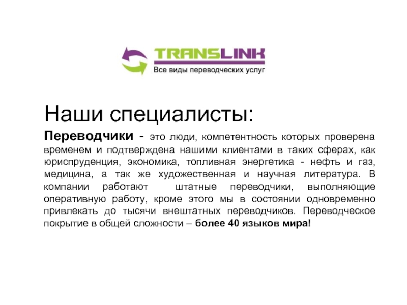 нашими клиентами в таких сферах, как юриспруденция, экономика, топливная энергетика - нефть и газ, медицина, а так же художественная и научная литература. В компании работают штатные переводчики, выполняющие оперативную работу, кроме этого мы в состоянии одновременно привлекать до тысячи внештатных переводчиков. Переводческое покрытие в общей сложности – более 40 языков мира!