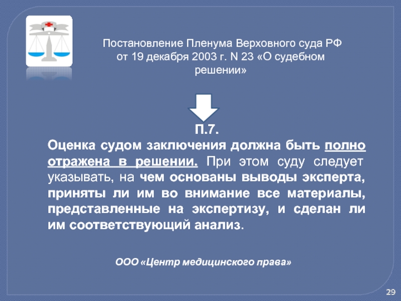 Оценка судом заключения должна быть полно отражена в решении. При этом суду следует указывать, на чем основаны выводы эксперта, приняты ли им во внимание все материалы, представленные на экспертизу, и сделан ли им соответствующий анализ.