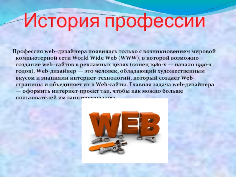 сети World Wide Web (WWW), в которой возможно создание web–сайтов в рекламных целях (конец 1980-х — начало 1990-х годов). Web-дизайнер — это человек, обладающий художественным вкусом и знаниями интернет-технологий, который создает Web-страницы и объединяет их в Web-сайты. Главная задача web-дизайнера — оформить интернет-проект так, чтобы как можно больше пользователей им заинтересовалось.