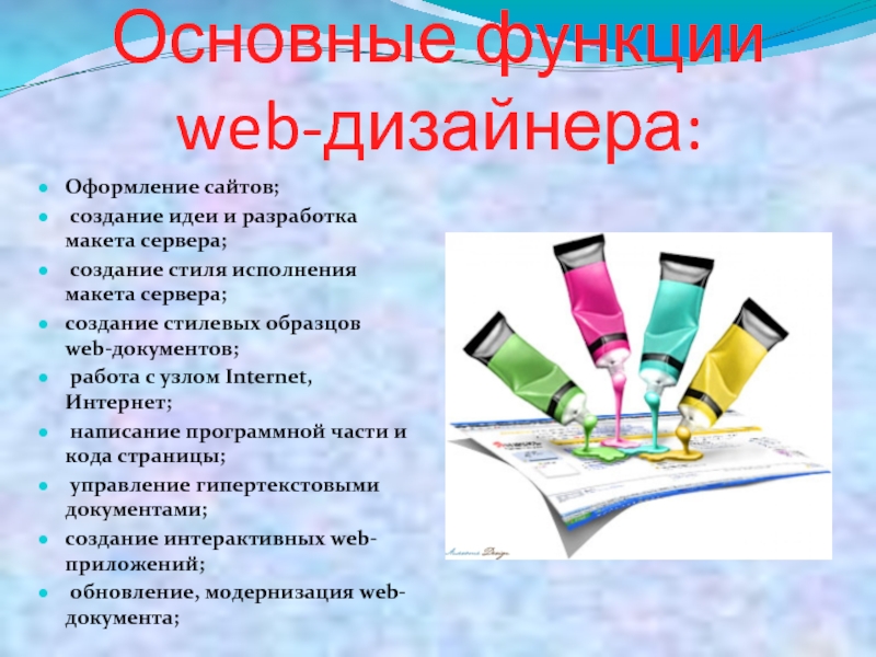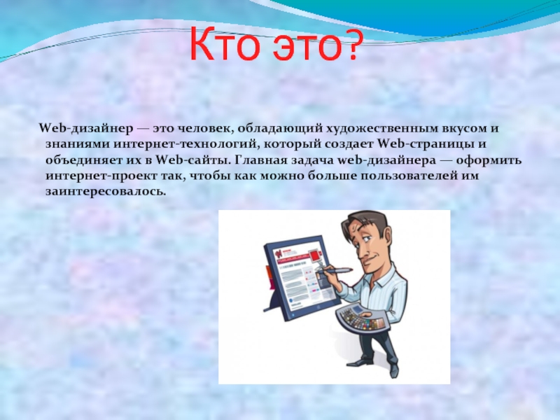 знаниями интернет-технологий, который создает Web-страницы и объединяет их в Web-сайты. Главная задача web-дизайнера — оформить интернет-проект так, чтобы как можно больше пользователей им заинтересовалось.