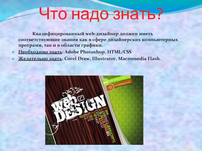 Квалифицированный web-дизайнер должен иметь соответствующие знания как в сфере