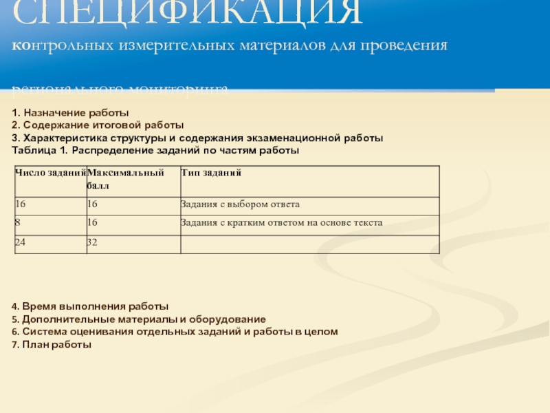 Количество заданий различной формы с указанием числа ответов к закрытым заданиям. Общее число заданий в тесте.