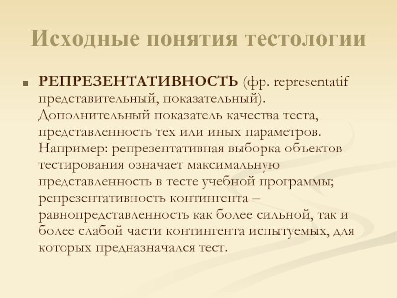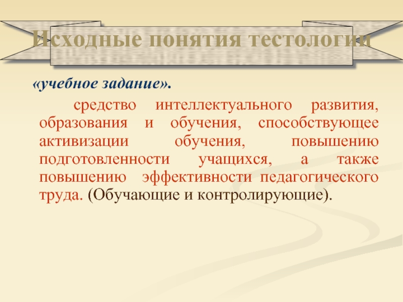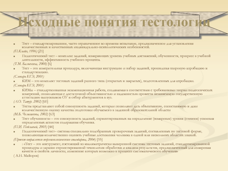 : «Тест – это инструмент, состоящий из квалиметрически выверенной системы тестовых заданий, стандартизированной процедуры и заранее спроектированной технологии обработки и анализа результатов, предназначенный для измерения качеств и свойств личности, изменение которых возможно в процессе систематического обучения»