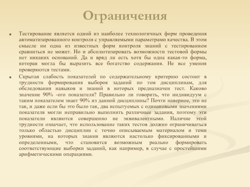 Скрытая слабость показателей по содержательному критерию состоит в трудности формирования выборок заданий по тем дисциплинам, для обследования навыков и знаний в которых предназначен тест. Каково значение 90% -ого показателя? Правильно ли говорить, что индивидуум с таким показателем знает 90% из данной дисциплины? Почти наверное, это не так, и даже если бы это было так, два испытуемых с одинаковыми значениями показателя могли неправильно выполнить различные задания, поэтому эти показатели являются совершенно не эквивалентными. Наличие этой трудности означает, что использование таких тестов должно ограничиваться только областью дисциплин с точно описываемым материалом и теми уровнями, на которых знания являются настолько фиксированными и определенными, что становится возможным реально формировать соответствующие выборки заданий, как например, в случае с простейшими арифметическими операциями.