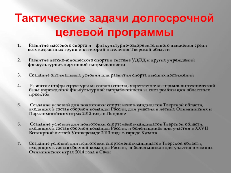 1. Обеспечение проведения спартакиады общеобразовательных учреждений Тверской области и областного этапа «Президентских состязаний», участие сборных команд школьников во всероссийских соревнованиях