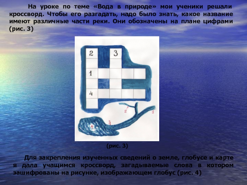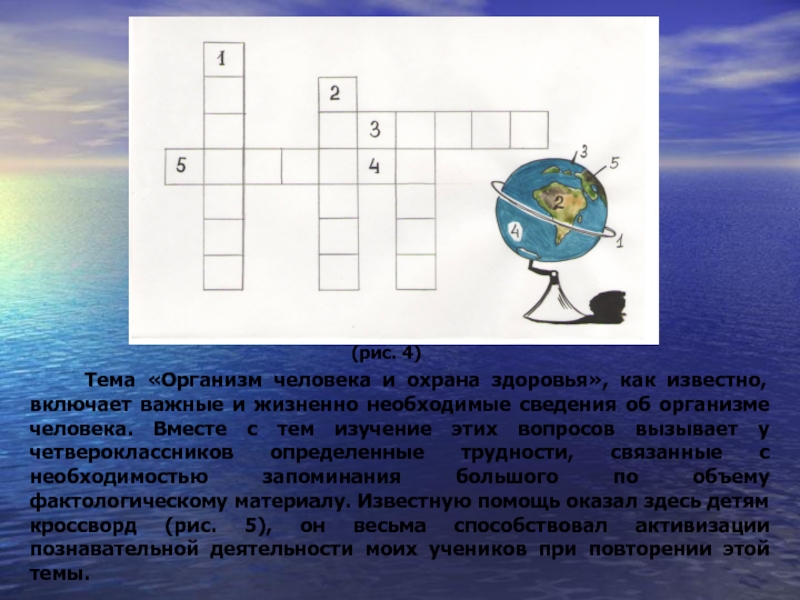 Для закрепления изученных сведений о земле, глобусе и карте я дала учащимся кроссворд, загадываемые слова в котором зашифрованы на рисунке, изображающем глобус (рис. 4)