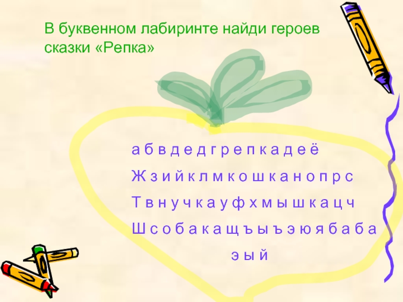 Слайд 17В буквенном лабиринте найди героев сказки «Репка»