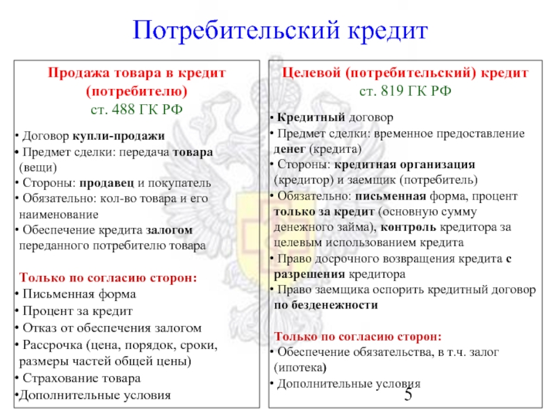 Предмет сделки: временное целевое предоставление денег (кредита) потребителю