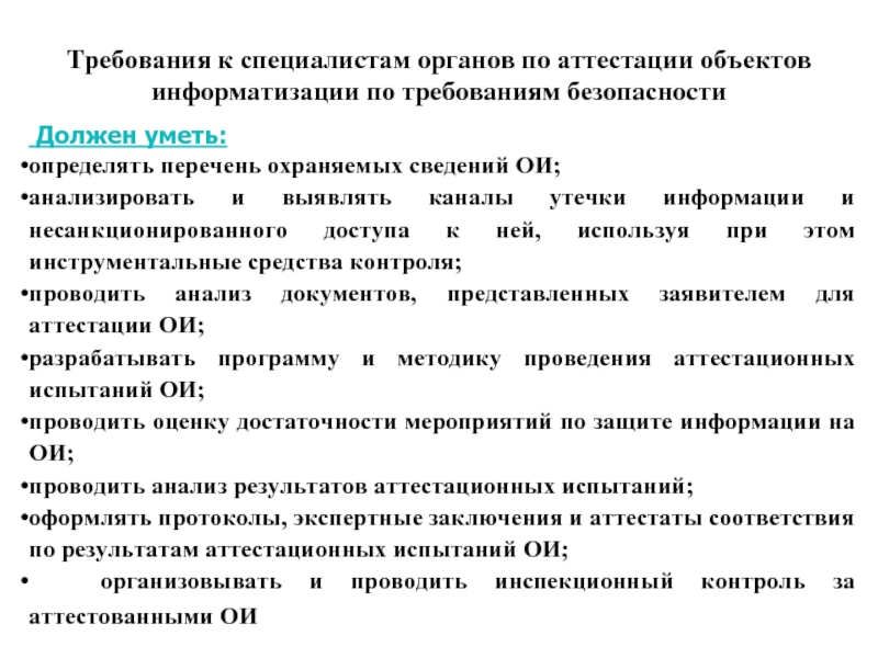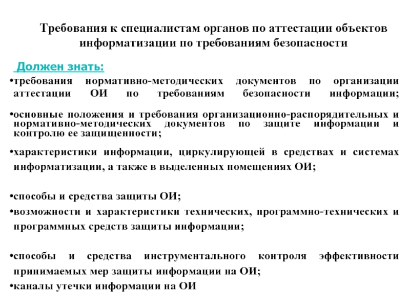 требования нормативно-методических документов по организации аттестации ОИ по требованиям безопасности информации;