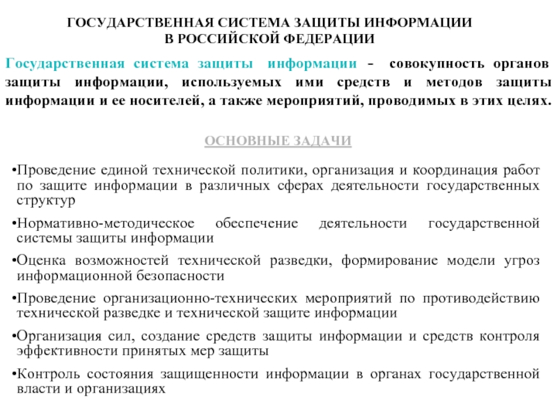 Проведение единой технической политики, организация и координация работ по защите информации в различных сферах деятельности государственных структур