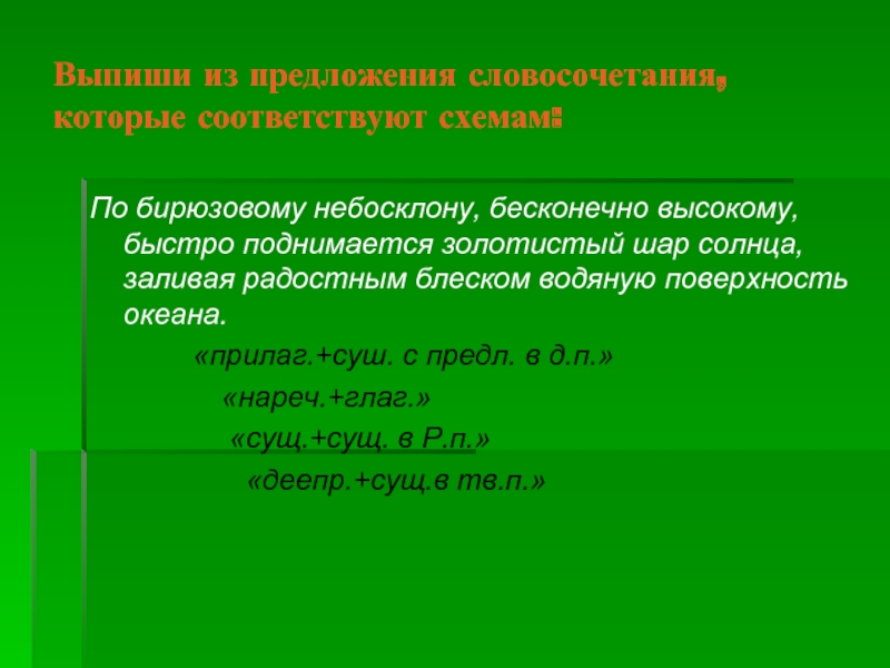 Слайд 9Выпиши из предложения словосочетания, которые соответствуют схемам: