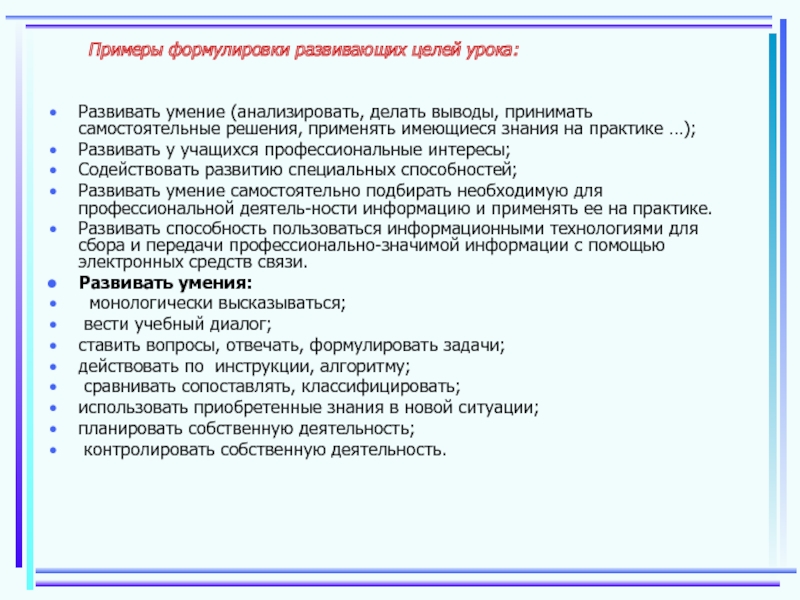 Слайд 8Примеры формулировки развивающих целей урока: