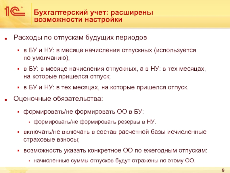 Слайд 9Бухгалтерский учет: расширены возможности настройки