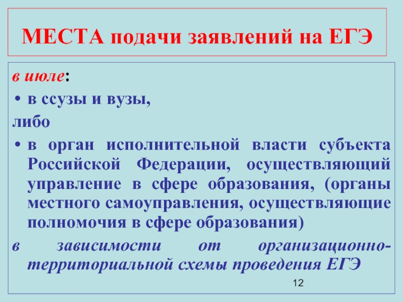 Слайд 12МЕСТА подачи заявлений на ЕГЭ