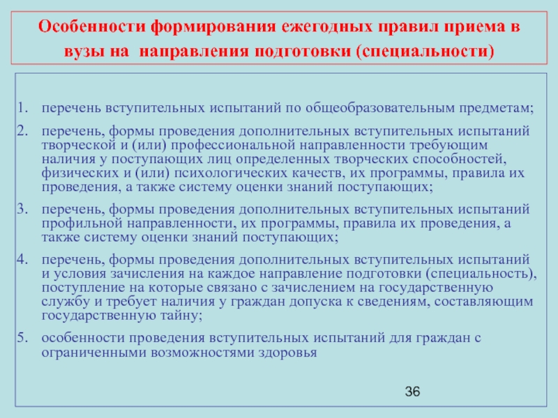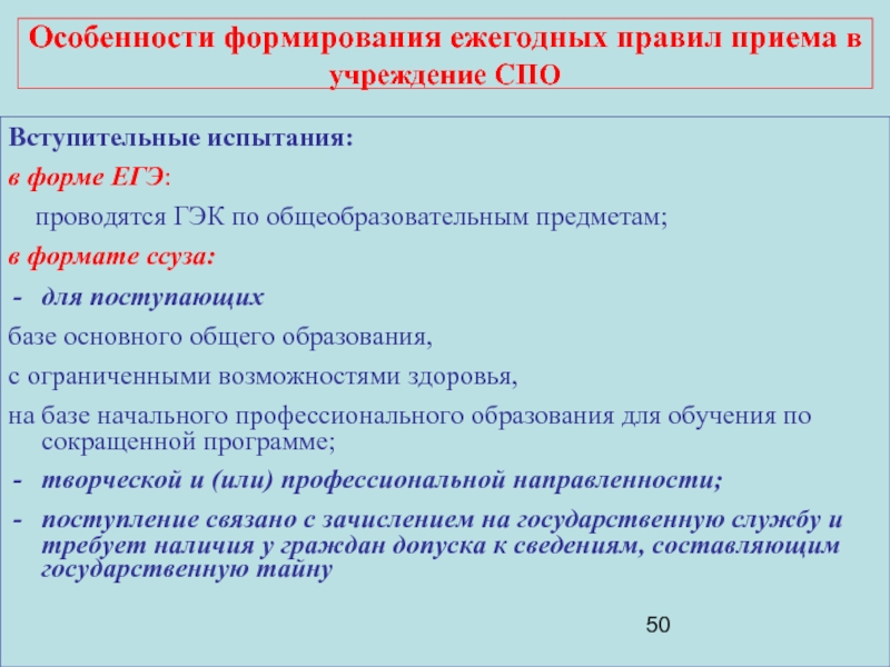 Слайд 50Особенности формирования ежегодных правил приема в учреждение СПО