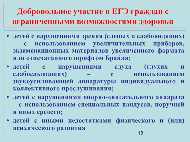 Слайд 18Добровольное участие в ЕГЭ граждан с ограниченными возможностями здоровья