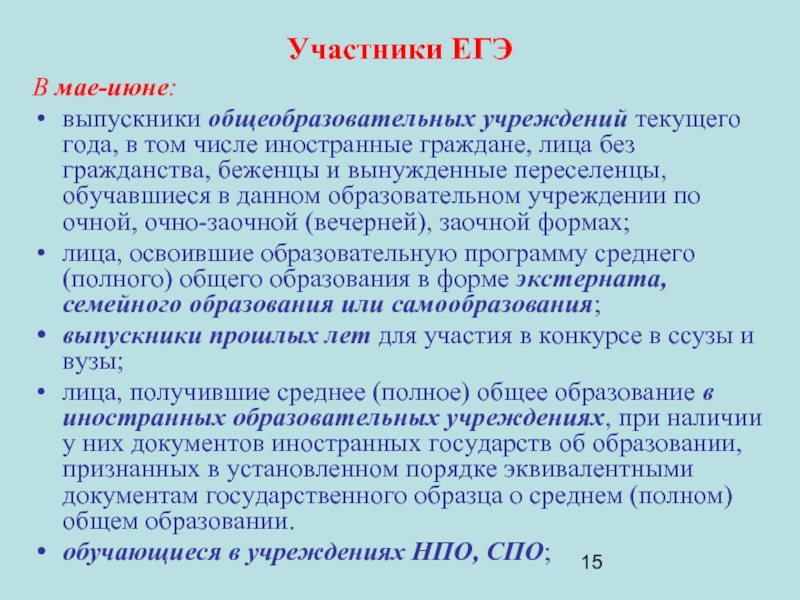 закончившие учреждения НПО, СПО в текущем учебном году и не имевшие возможности участвовать в ЕГЭ в мае-июне;