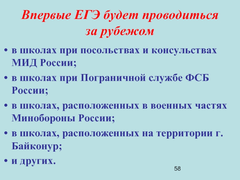 Слайд 58Впервые ЕГЭ будет проводиться за рубежом