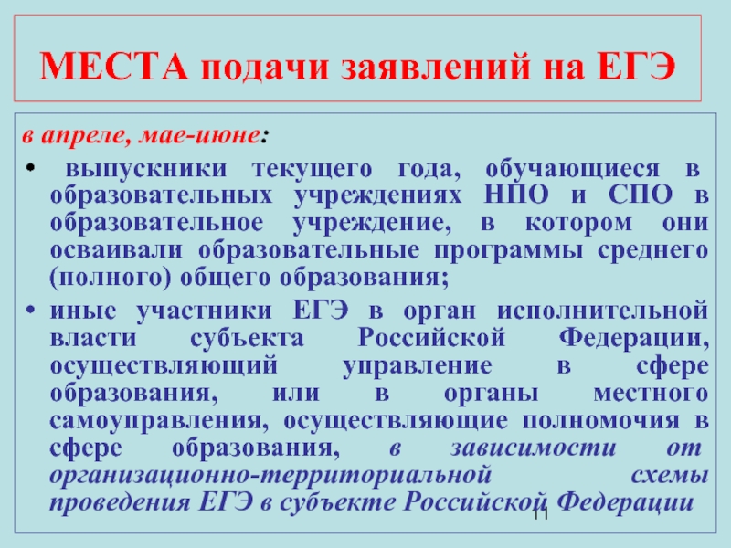 Слайд 11МЕСТА подачи заявлений на ЕГЭ
