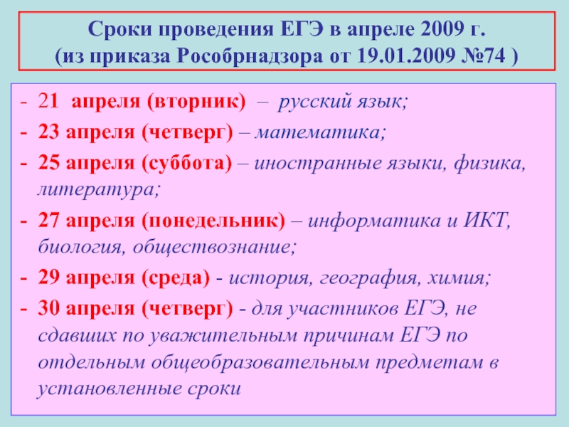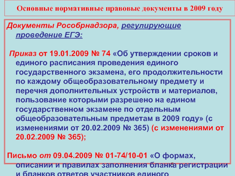 Приказ от 19.01.2009 № 74 «Об утверждении сроков и единого расписания проведения единого государственного экзамена, его продолжительности по каждому общеобразовательному предмету и перечня дополнительных устройств и материалов, пользование которыми разрешено на едином государственном экзамене по отдельным общеобразовательным предметам в 2009 году» (с изменениями от 20.02.2009 № 365) (с изменениями от 20.02.2009 № 365);