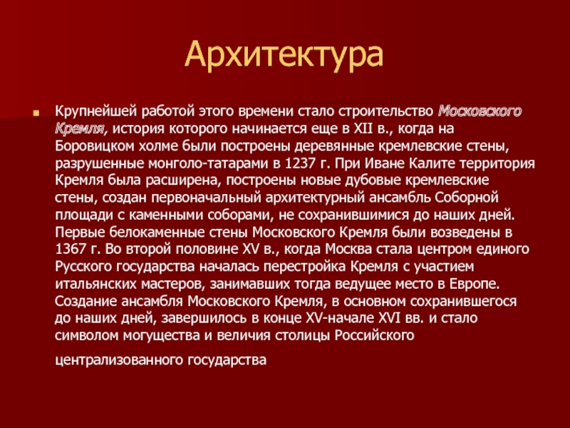 еще в XII в., когда на Боровицком холме были построены деревянные кремлевские стены, разрушенные монголо-татарами в 1237 г. При Иване Калите территория Кремля была расширена, построены новые дубовые кремлевские стены, создан первоначальный архитектурный ансамбль Соборной площади с каменными соборами, не сохранившимися до наших дней. Первые белокаменные стены Московского Кремля были возведены в 1367 г. Во второй половине XV в., когда Москва стала центром единого Русского государства началась перестройка Кремля с участием итальянских мастеров, занимавших тогда ведущее место в Европе. Создание ансамбля Московского Кремля, в основном сохранившегося до наших дней, завершилось в конце XV-начале XVI вв. и стало символом могущества и величия столицы Российского централизованного государства
