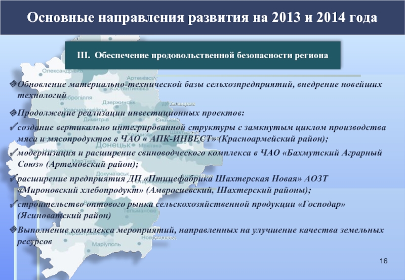 расширение предприятия ДП «Птицефабрика Шахтерская Новая» АОЗТ «Мироновский хлебопродукт» (Амвросиевский, Шахтерский районы);