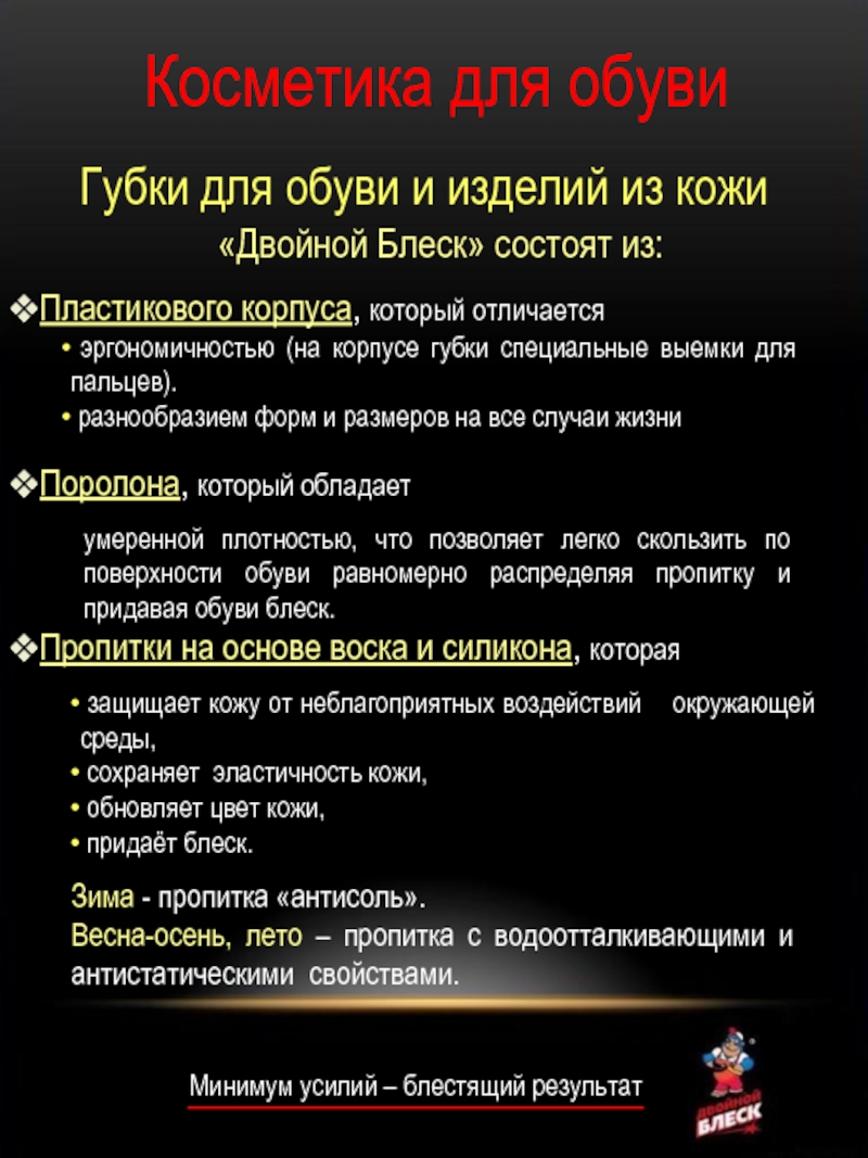 умеренной плотностью, что позволяет легко скользить по поверхности обуви равномерно распределяя пропитку и придавая обуви блеск.