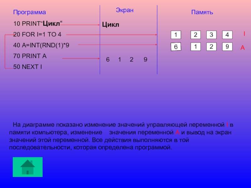 На диаграмме показано изменение значений управляющей переменной I в памяти компьютера, изменение значения переменной А и вывод на экран значений этой переменной. Все действия выполняются в той последовательности, которая определена программой.