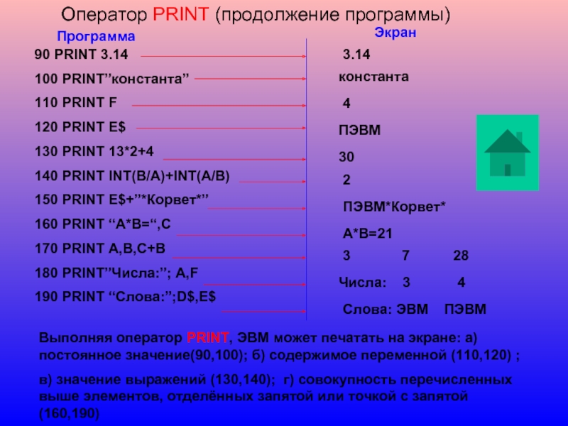 в) PRINT “ЭВМ”- компьютер печатает на экране текст {ЭВМ }