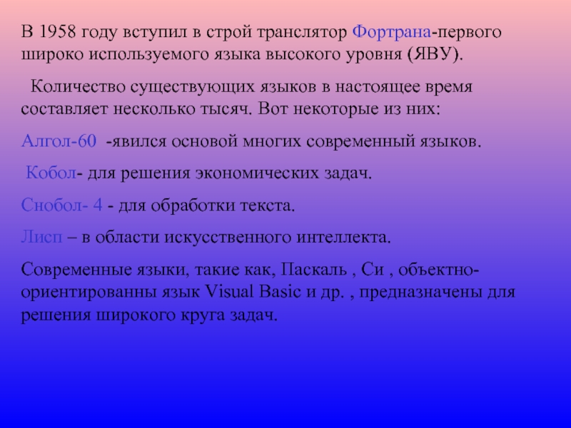 Слайд 4В 1958 году вступил в строй транслятор Фортрана-первого широко используемого языка