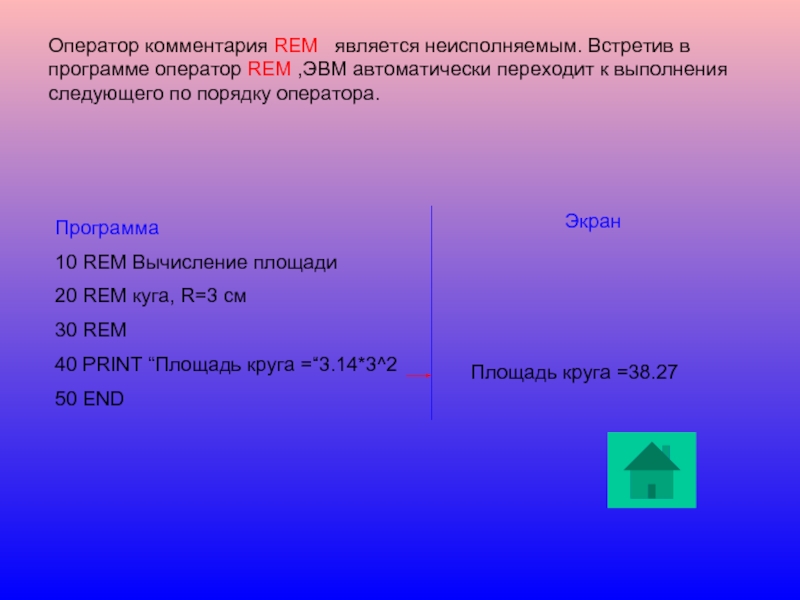б) PRINT A/5 – прочитав выражение , PRINT передаёт его Арифмометру, а полученное значение печатает на экране видеомонитора.