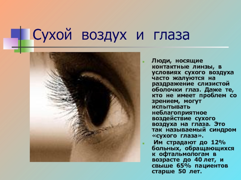 часто жалуются на раздражение слизистой оболочки глаз. Даже те, кто не имеет проблем со зрением, могут испытывать неблагоприятное воздействие сухого воздуха на глаза. Это так называемый синдром «сухого глаза».