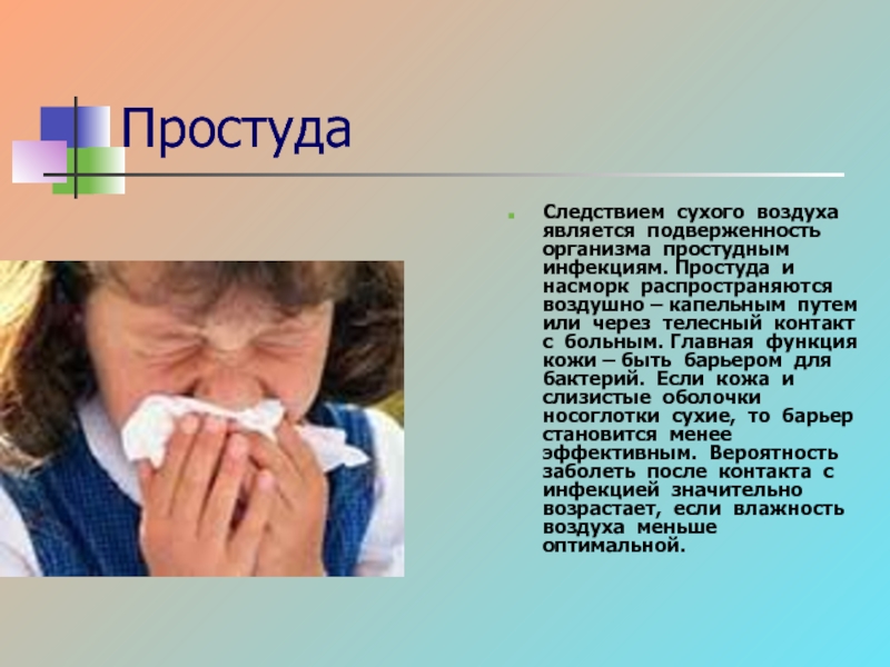 Следствием сухого воздуха является подверженность организма простудным инфекциям. Простуда и насморк