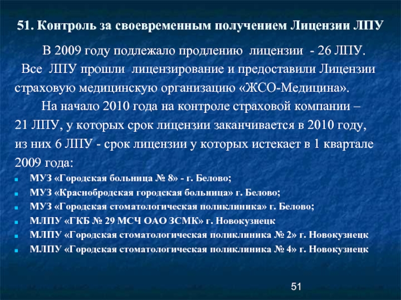 Слайд 5151. Контроль за своевременным получением Лицензии ЛПУ