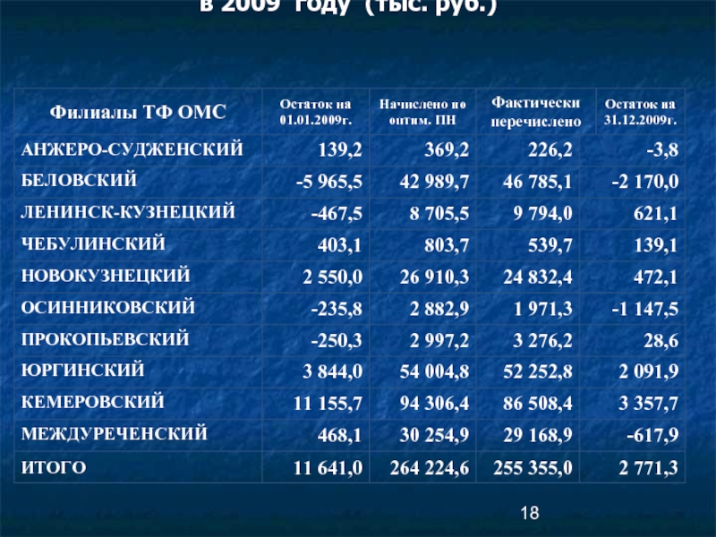 Слайд 1919. Начисление и финансирование по филиалам ТФ ОМС в 2009 году