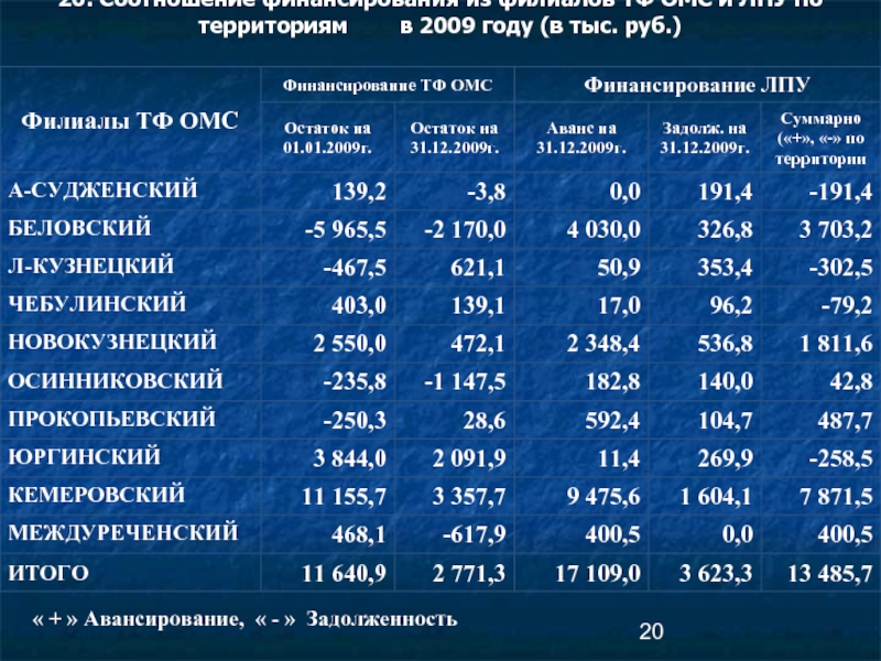 Слайд 2020. Соотношение финансирования из филиалов ТФ ОМС и ЛПУ по территориям