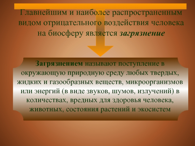 Загрязнением называют поступление в окружающую природную среду любых твердых, жидких и газообразных веществ, микроорганизмов или энергий (в виде звуков, шумов, излучений) в количествах, вредных для здоровья человека, животных, состояния растений и экосистем