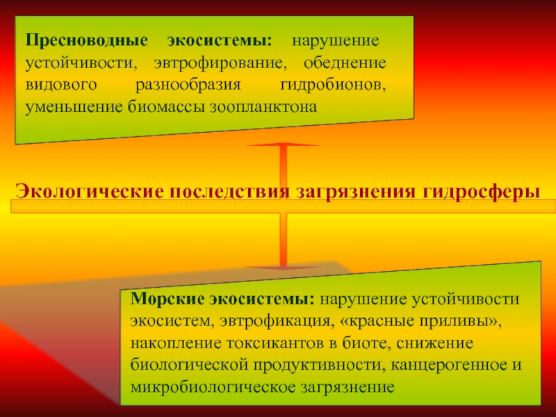 Морские экосистемы: нарушение устойчивости экосистем, эвтрофикация, «красные приливы», накопление токсикантов в биоте, снижение биологической продуктивности, канцерогенное и микробиологическое загрязнение