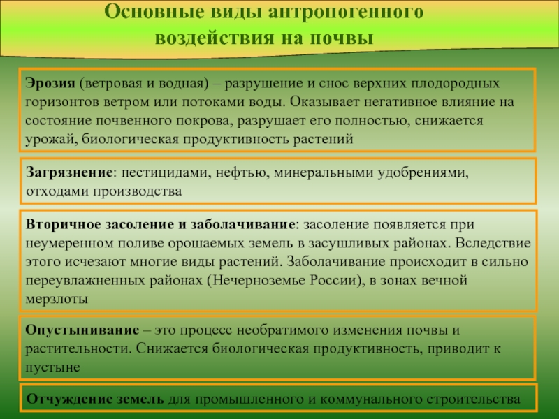 Вторичное засоление и заболачивание: засоление появляется при неумеренном поливе орошаемых земель в засушливых районах. Вследствие этого исчезают многие виды растений. Заболачивание происходит в сильно переувлажненных районах (Нечерноземье России), в зонах вечной мерзлоты