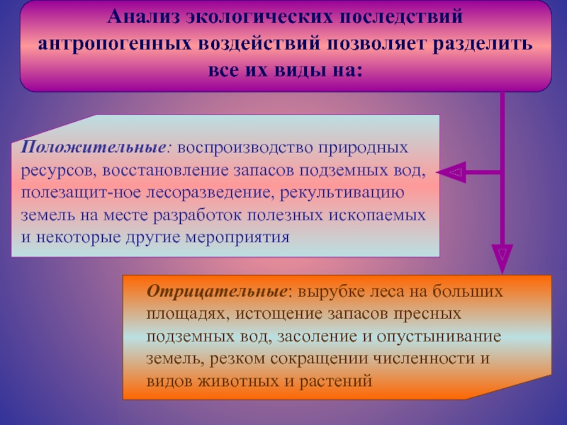 Положительные: воспроизводство природных ресурсов, восстановление запасов подземных вод, полезащитное лесоразведение, рекультивацию земель на месте разработок полезных ископаемых и некоторые другие мероприятия