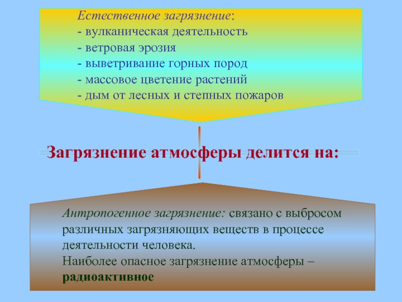 Антропогенное загрязнение: связано с выбросом различных загрязняющих веществ в процессе деятельности человека.
