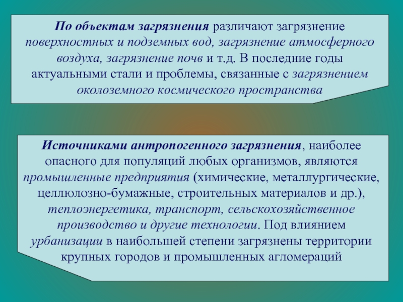 Источниками антропогенного загрязнения, наиболее опасного для популяций любых организмов, являются промышленные предприятия (химические, металлургические, целлюлозно-бумажные, строительных материалов и др.), теплоэнергетика, транспорт, сельскохозяйственное производство и другие технологии. Под влиянием урбанизации в наибольшей степени загрязнены территории крупных городов и промышленных агломераций