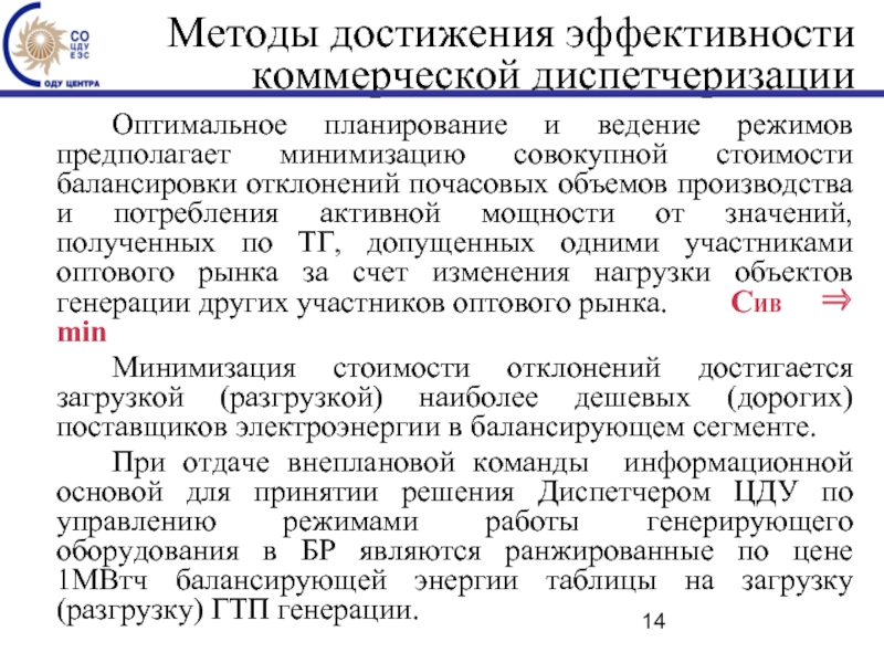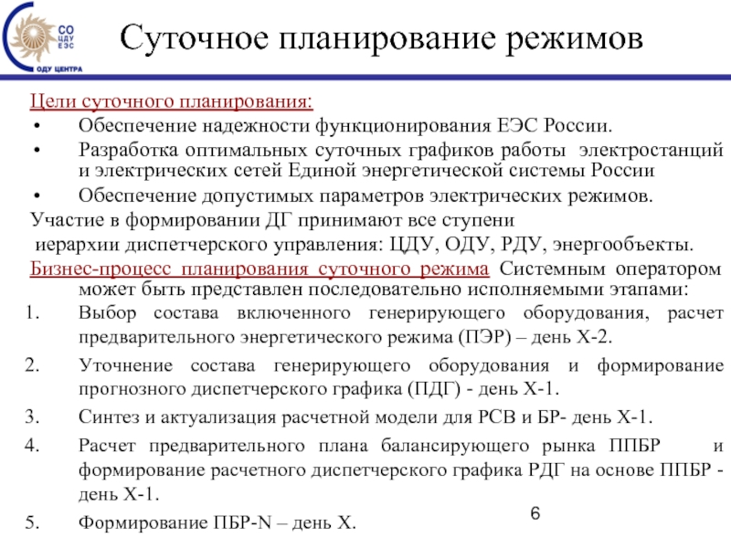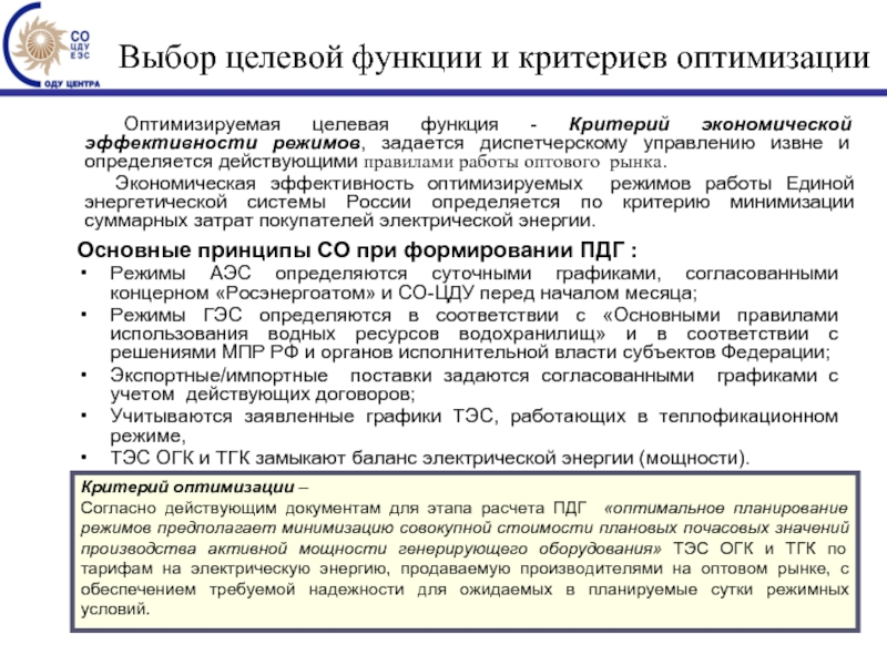 Согласно действующим документам для этапа расчета ПДГ «оптимальное планирование режимов предполагает минимизацию совокупной стоимости плановых почасовых значений производства активной мощности генерирующего оборудования» ТЭС ОГК и ТГК по тарифам на электрическую энергию, продаваемую производителями на оптовом рынке, с обеспечением требуемой надежности для ожидаемых в планируемые сутки режимных условий.