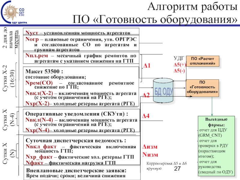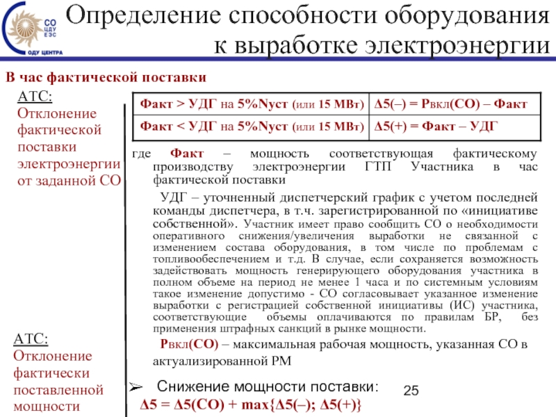УДГ – уточненный диспетчерский график с учетом последней команды диспетчера, в т.ч. зарегистрированной по «инициативе собственной». Участник имеет право сообщить СО о необходимости оперативного снижения/увеличения выработки не связанной с изменением состава оборудования, в том числе по проблемам с топливообеспечением и т.д. В случае, если сохраняется возможность задействовать мощность генерирующего оборудования участника в полном объеме на период не менее 1 часа и по системным условиям такое изменение допустимо - СО согласовывает указанное изменение выработки с регистрацией собственной инициативы (ИС) участника, соответствующие объемы оплачиваются по правилам БР, без применения штрафных санкций в рынке мощности.