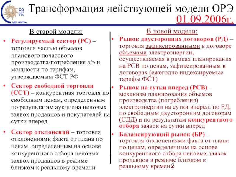 Рынок двусторонних договоров (РД) – торговля зафиксированными в договоре объемами электроэнергии, осуществляемая в рамках планирования на РСВ по ценам, зафиксированным в договорах (ежегодно индексируемые тарифы ФСТ)