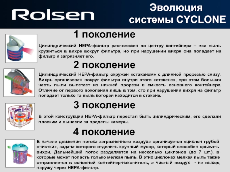 Цилиндрический HEPA-фильтр окружен «стаканом» с длинной прорезью снизу. Вихрь организован вокруг фильтра внутри этого «стакана», при этом большая часть пыли вылетает из нижней прорези в емкость основного контейнера. Отличие от первого поколения лишь в том, сто при нарушении вихря на фильтр попадает только та пыль которая находится в стакане.