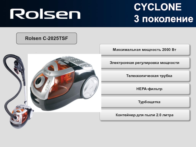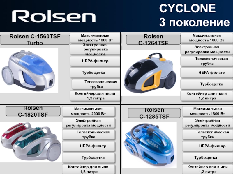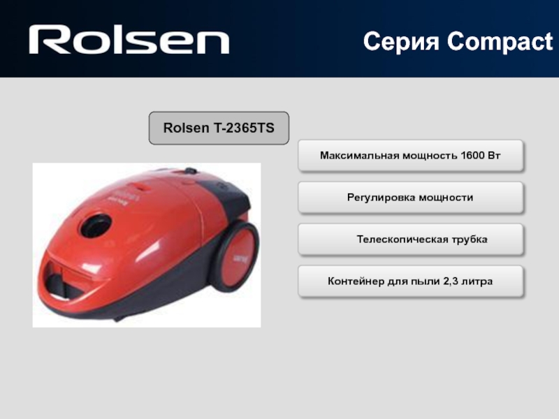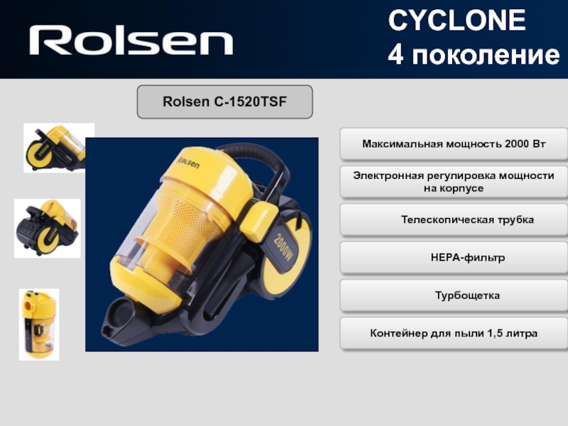 Компания Rolsen Electronics представляет новый пылесос - максимально мощный, улучшенного дизайна и с пониженным уровнем шума! Многие считают, что чем громче шумит при эксплуатации пылесос, тем он мощнее. Но это мнение ошибочно. При своей мощности 2 200Вт, уровень шума составляет всего 65дБ! Минимум внешних раздражителей, максимум комфорта!